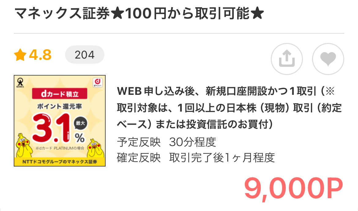 ポイントの付与率は変動するため、今が過去最高水準の今こそ申し込みのベストタイミング。まずはモッピーに無料登録して(紹介コード:cwCme102)、マネックス証券の案件ページへ進んでみてください!