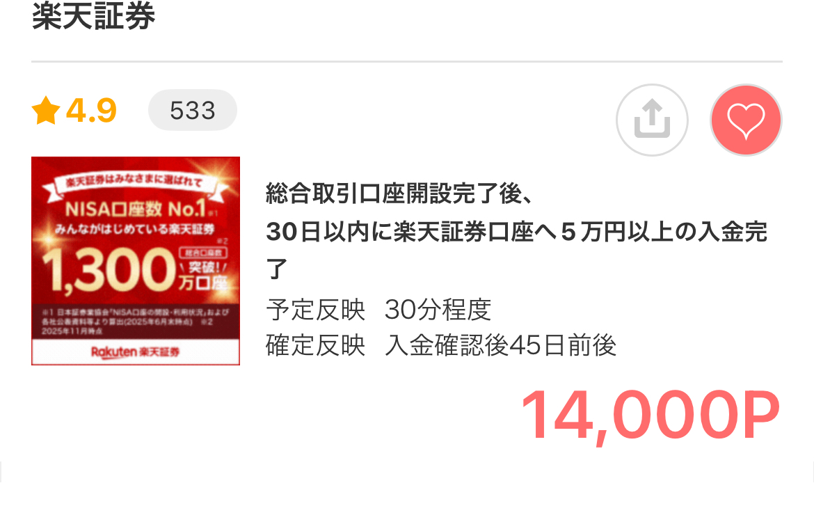 正直、最初は「本当にもらえるの?」と半信半疑でした。でも実際にモッピー経由で楽天証券の口座を開設してみると、約3週間後にしっかりポイントが反映されていました。