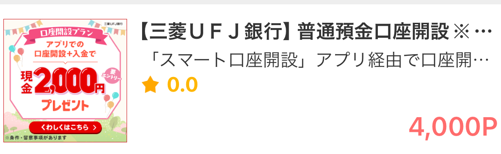 実は三菱UFJ銀行の口座を開設するだけで、4,000円相当のポイントが簡単にもらえる超お得な案件があります。しかもモッピー経由なら条件が一番シンプルで、はじめてのポイ活にもぴったり。